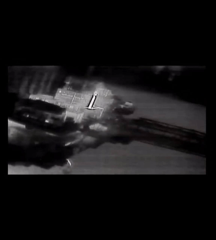 Камера, встановлена на безпілотнику, зафіксувала вдале попадання в район газотурбінної установки платформи.