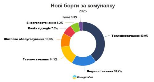 Згідно з їхньою інформацією, найбільшу частину заборгованості українці мають за теплопостачання (40%), до першої трійки за боргами увійшли також водопостачання (18,2%) та газопостачання (14,5%).