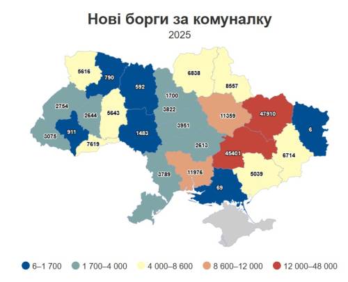 Найбільші борги за житлово-комунальні послуги мають у Харківській (47,9 тис. проваджень) та Дніпропетровській (45,4 тис.) областях.