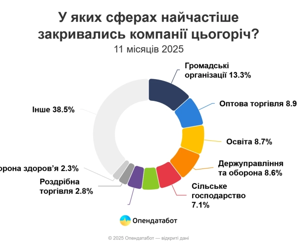 За 11 місяців 2025 року з бізнес-ландшафту України зникло більше ніж 11 тисяч компаній. Найчастіше діяльність припиняли у Києві, Дніпропетровській та Львівській областях, а найбільш уразливими були визнані громадські об’єднання. Про це інформує Опендатабот, передає УНН.