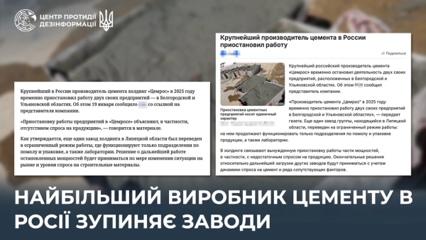 Концерн “Цемрос”, що утримує 33% російського ринку цементу, призупинив діяльність двох підприємств – у Бєлгородській та Ульяновській областях. Ще одне виробництво у Липецькій області перейшло на скорочений графік – фірма перевела робітників на чотириденний робочий тиждень. Про це інформує Центр протидії дезінформації РНБО України (ЦПД), повідомляє УНН.