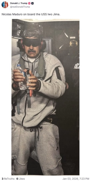 Дональд Трамп оприлюднив знімок Ніколаса Мадуро на палубі авіаносця USS Iwo Jima після його арешту американським спецпідрозділом. Мадуро постане перед американським правосуддям за обвинуваченнями у наркотичному тероризмі та нелегальній торгівлі зброєю.