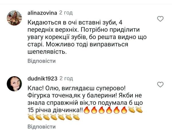 Фігурка виточена, як у балерини. Якби не знала дійсний вік, то подумала б, що 15-річна дівчинка. Впадають в очі вставні зуби. 4 передніх верхніх. Потрібно звернути увагу на корекцію зубів. Бо решта видно, що старі. Можливо тоді виправиться шепелявість