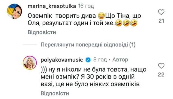 В коментарях під публікацією одна із підписниць висловила думку, що Полякова змогла скинути вагу за допомогою спеціалізованих медикаментів. На думку дописувачки, йшлося про Оземпік.