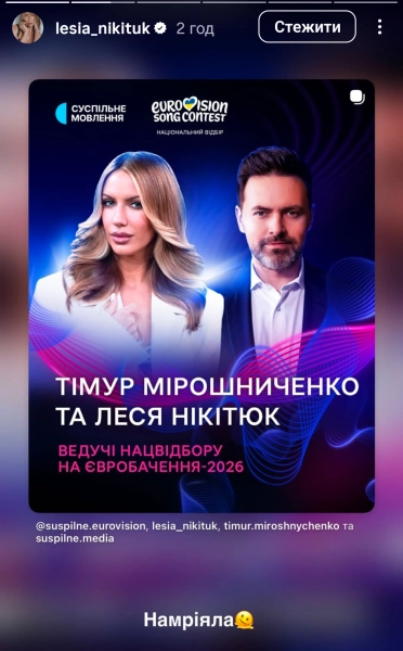 Українська телезірка Леся Нікітюк буде серед тих, хто проводитиме Національний відбір на Євробачення-2026. Разом з нею вестиме програму Тимур Мірошниченко, а Анна Тульєва буде представляти передшоу.