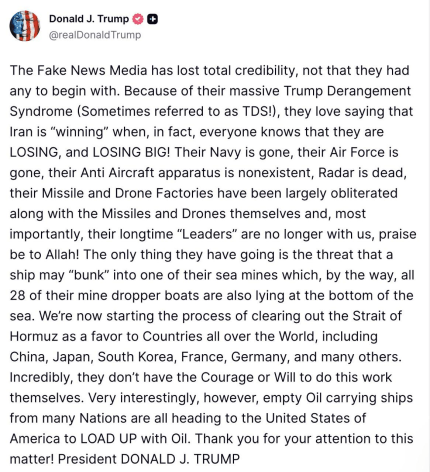 Зараз ми починаємо процес розмінування Ормузької протоки як послугу країнам усього світу, включно з Китаєм, Японією, Південною Кореєю, Францією, Німеччиною та багатьма іншими. Неймовірно, але у них немає ні сміливості, ні волі, щоб виконати цю роботу самостійно. Однак, що дуже цікаво, порожні нафтовози з багатьох країн прямують до США, щоб завантажитися нафтою.