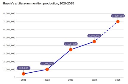 Служба зовнішньої розвідки Естонії дізналася про те, що протягом минулого року заводи у Росії встигли виробити понад 7 мільйонів снарядів, мінометних мін і ракет, порівняно з 4,5 мільйона у 2024 році.