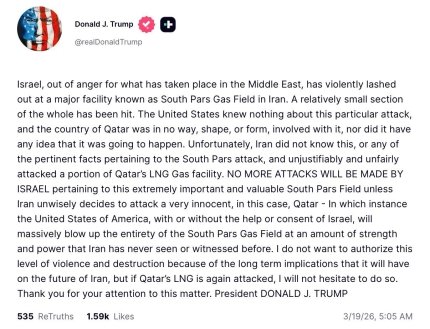 Я не хочу санкціонувати такий рівень насильства і руйнувань через довгострокові наслідки, які це матиме для майбутнього Ірану, але якщо катарський завод із виробництва скрапленого природного газу знову зазнає нападу, я без вагань це зроблю.