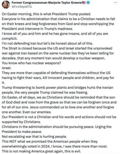 Ультраправа республіканка Марджорі Тейлор Ґрін публічно звернулася до членів адміністрації Дональда Трампа з закликом повстати проти президента США, поки не стало надто пізно. На її переконання, дії очільника Білого дому можуть призвести до краху США.