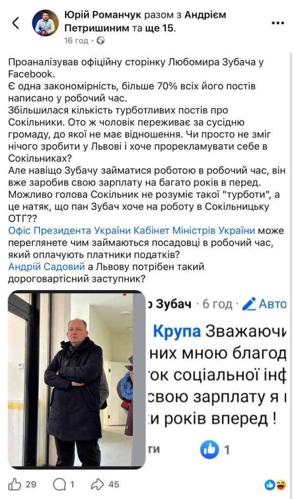 Редакція звернула увагу на допис громадського активіста Юрія Романчука, який проаналізував робочу активність заступника міського голови Львова Любомира Зубача у Facebook.