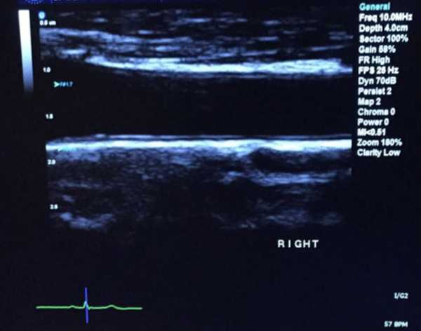 Екран ультразвукового дослідження, що показує 2D-зображення сегмента загальної сонної артерії. Центральна чорна область – це канал усередині сонної кровоносної судини, а більш чіткі шари з кожного боку цього центрального каналу – це стінки артерії. На периферії зображення показано м’які тканини, що оточують артерію.