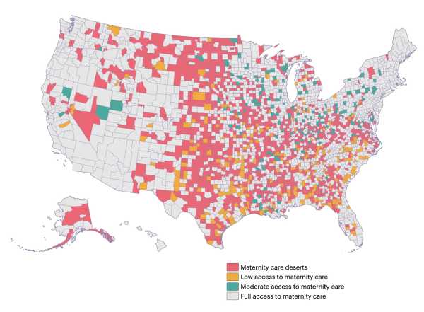 Станом на 2022 рік 52% сільських лікарень не надавали акушерської допомоги, і з того часу проблема погіршилася. Згідно з дослідженням 2024 року в журналі JAMA, 238 сільських лікарень припинили надавати акушерські послуги між 2010 і 2022 роками, і лише 26 сільських лікарень додали акушерські послуги до своїх пропозицій за цей період. (За той самий період 299 міських лікарень втратили акушерські послуги, але 112 додали нові.)
