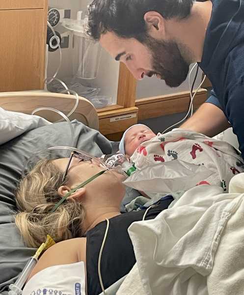 Джордін Олбрайт у лікарні зі своїм сином та чоловіком одразу після пологів. За кілька хвилин у неї почалася кровотеча, і її медична бригада перелила 6 пінт крові, щоб врятувати їй життя.