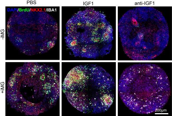 Команда дослідників виявила, що мікроглія в їхніх органоїдах була ключовим джерелом інсуліноподібного фактора росту 1 (IGF1) у міні-мозках, що розвиваються, і що ця речовина сприяла різкому збільшенню кількості інтернейронів, яке спостерігається на ранніх стадіях розвитку.
