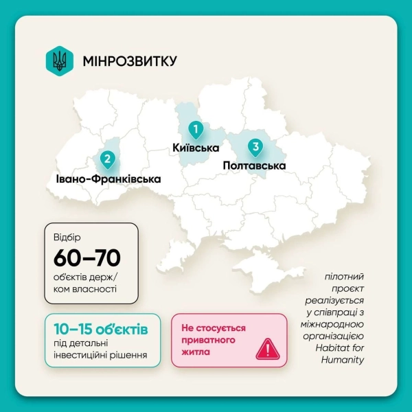 Відзначимо, проєкт втілюється на виконання Закону України №4080-IX, котрий передбачає додаткові механізми забезпечення ВПО житлом. На початковому етапі заплановано пілот у трьох областях: Київській, Івано-Франківській та Полтавській. Зараз триває відбір 60–70 об’єктів, з яких для підготовки докладних інвестиційних рішень мають обрати 10–15 – там, де перебудова є технічно та економічно обґрунтованою.