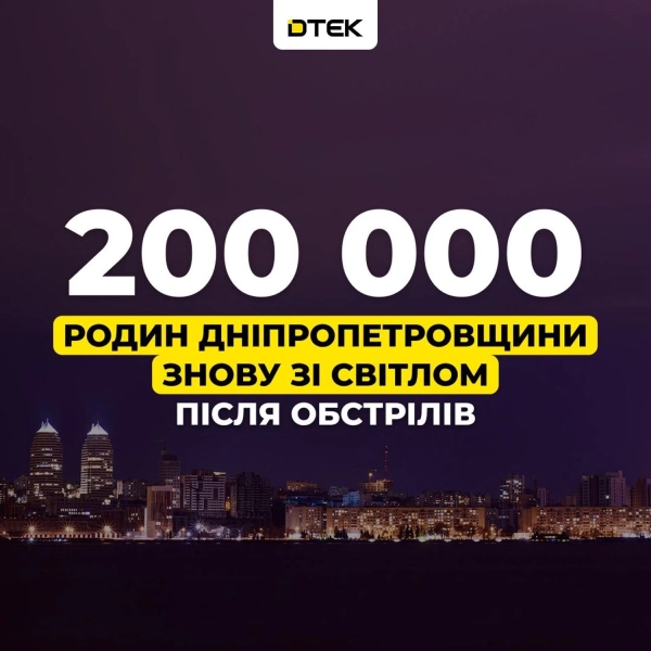 У Дніпропетровській області повернули електроенергію до домівок 200 000 сімей після російських атак. Про це інформує УНН, посилаючись на ДТЕК.
