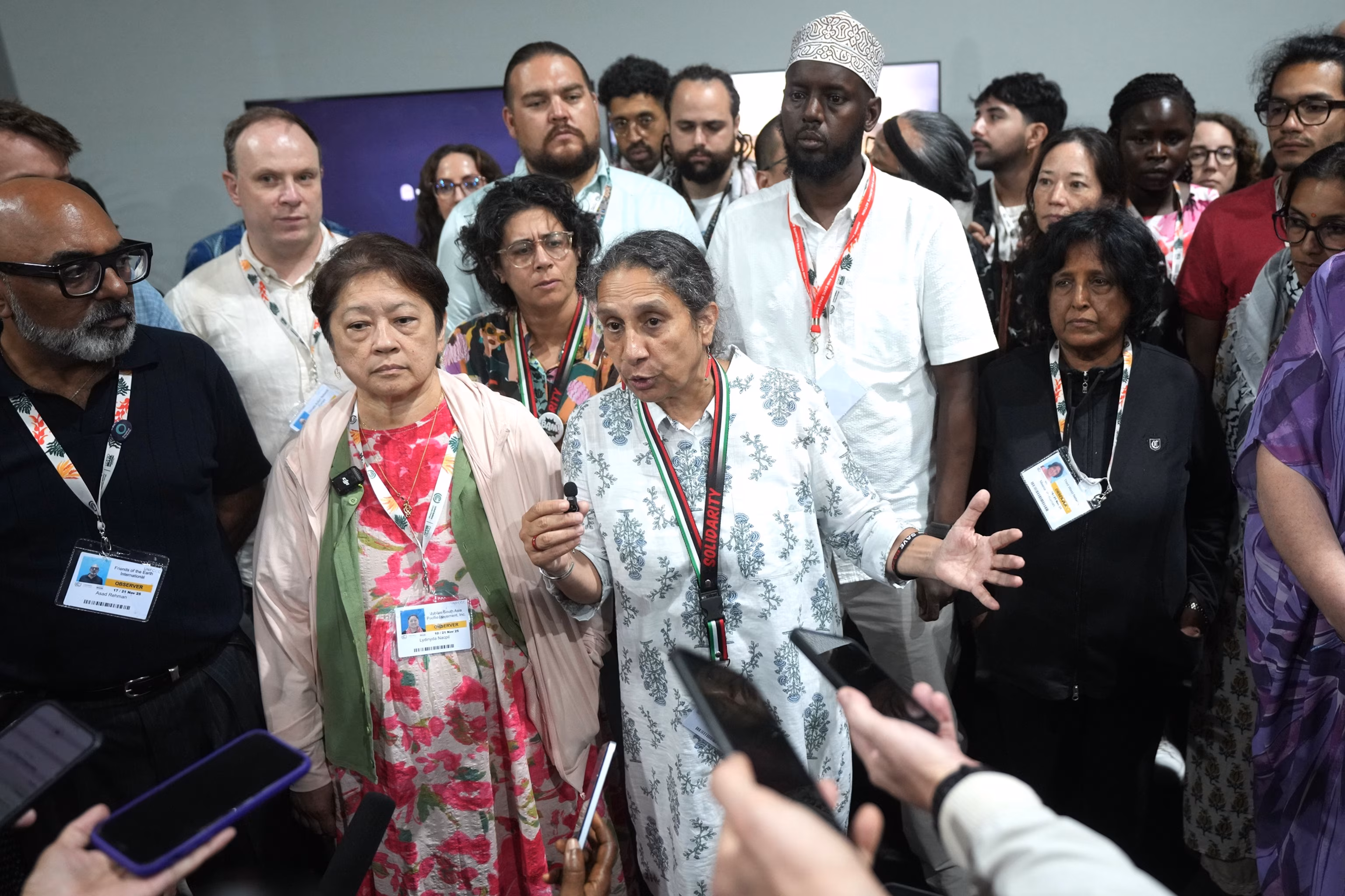 Таснім Ессоп (у центрі) з Південної Африки, виконавчий директор організації «Climate Action», виступає поруч із Ліді Накпіл, представницею Азійського народного руху за борги та розвиток (Філіппіни, лівоцентристка) та іншими під час Кліматичного саміту ООН COP30, 21 листопада 2025 року, в Белемі, Бразилія. Андре Пеннер/AP