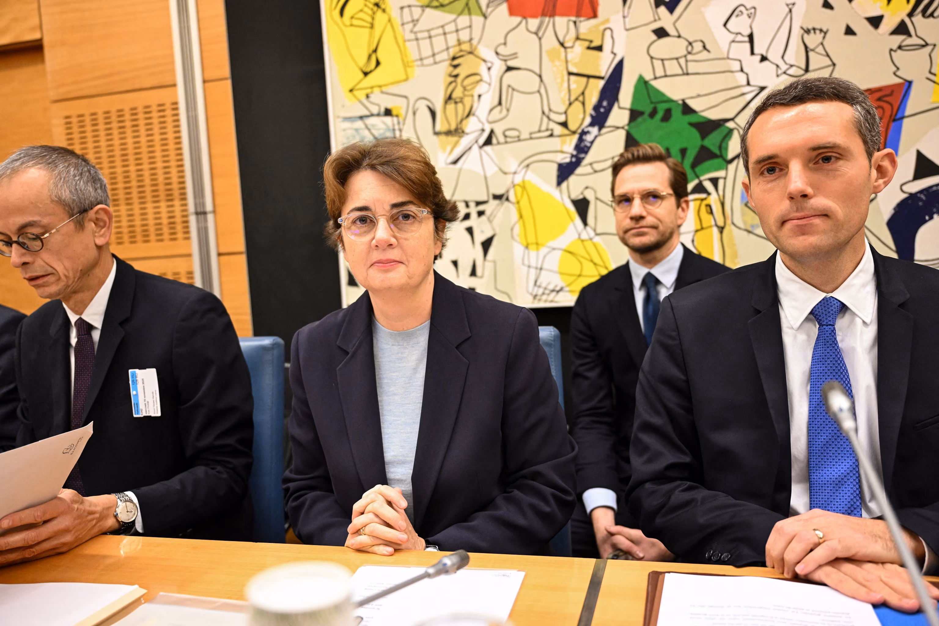 Президент і директор музею Лувру Лоранс де Кар (у центрі) спостерігає за свідченнями перед Комітетом з питань культури Національних зборів у Парижі, 19 листопада 2025 року. Бертран Гей/AFP via Getty Images