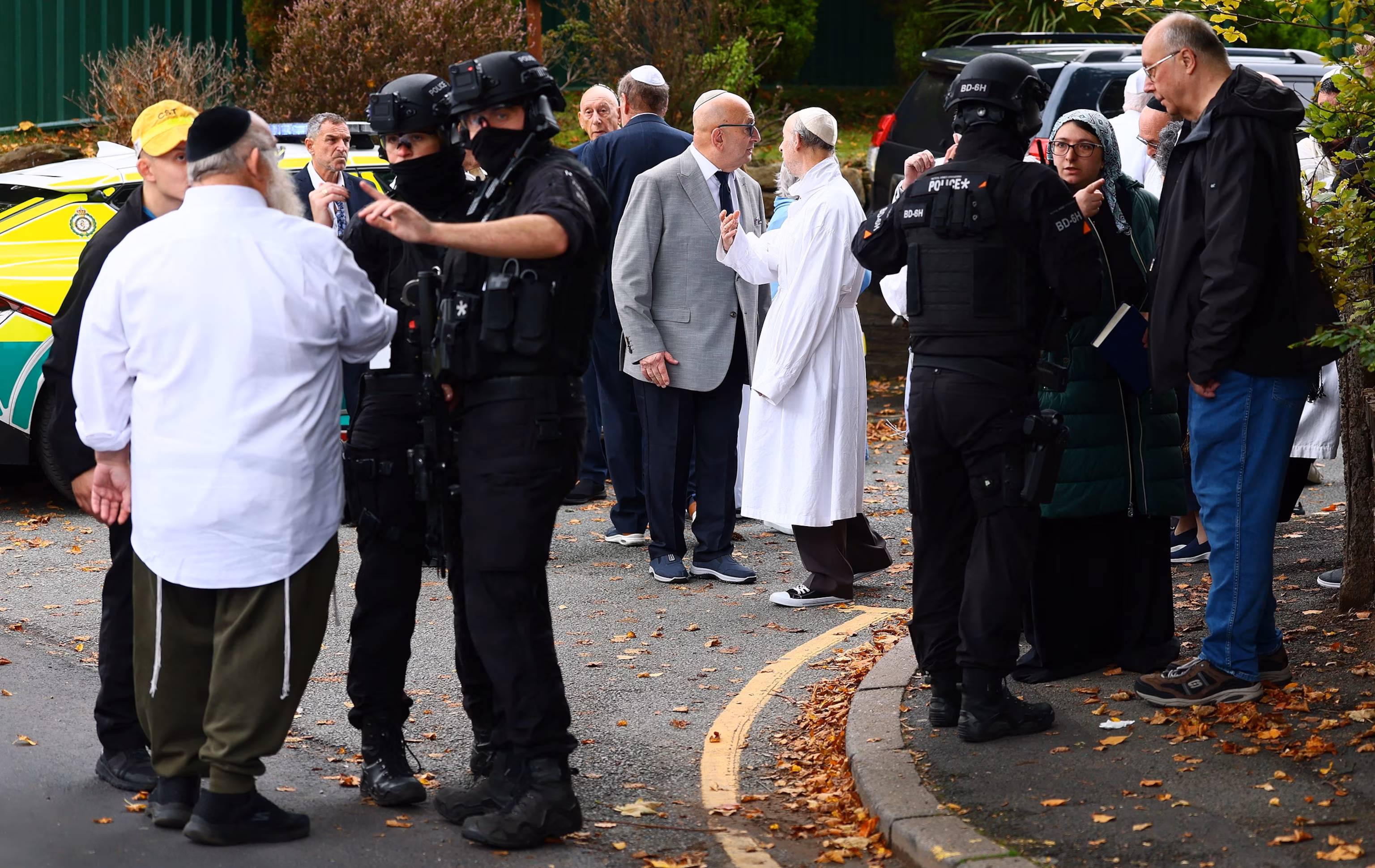 Озброєні поліцейські розмовляють з членами громади біля синагоги єврейської громади Хітон-Парк у Крампсоллі, північний Манчестер, 2 жовтня 2025 року. Пол Керрі/AFP через Getty Images