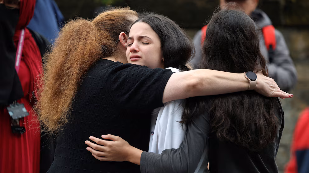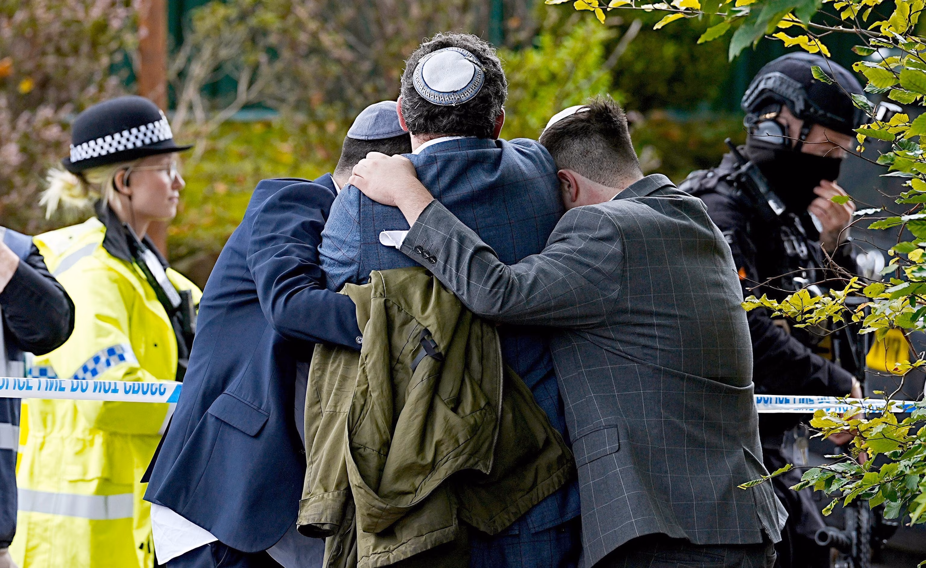 Члени єврейської громади втішають одне одного біля синагоги єврейської громади Хітон-Парк у Крампсоллі, Манчестер, Англія, 2 жовтня 2025 року після нападу на синагогу. Пітер Бірн/PA via AP
