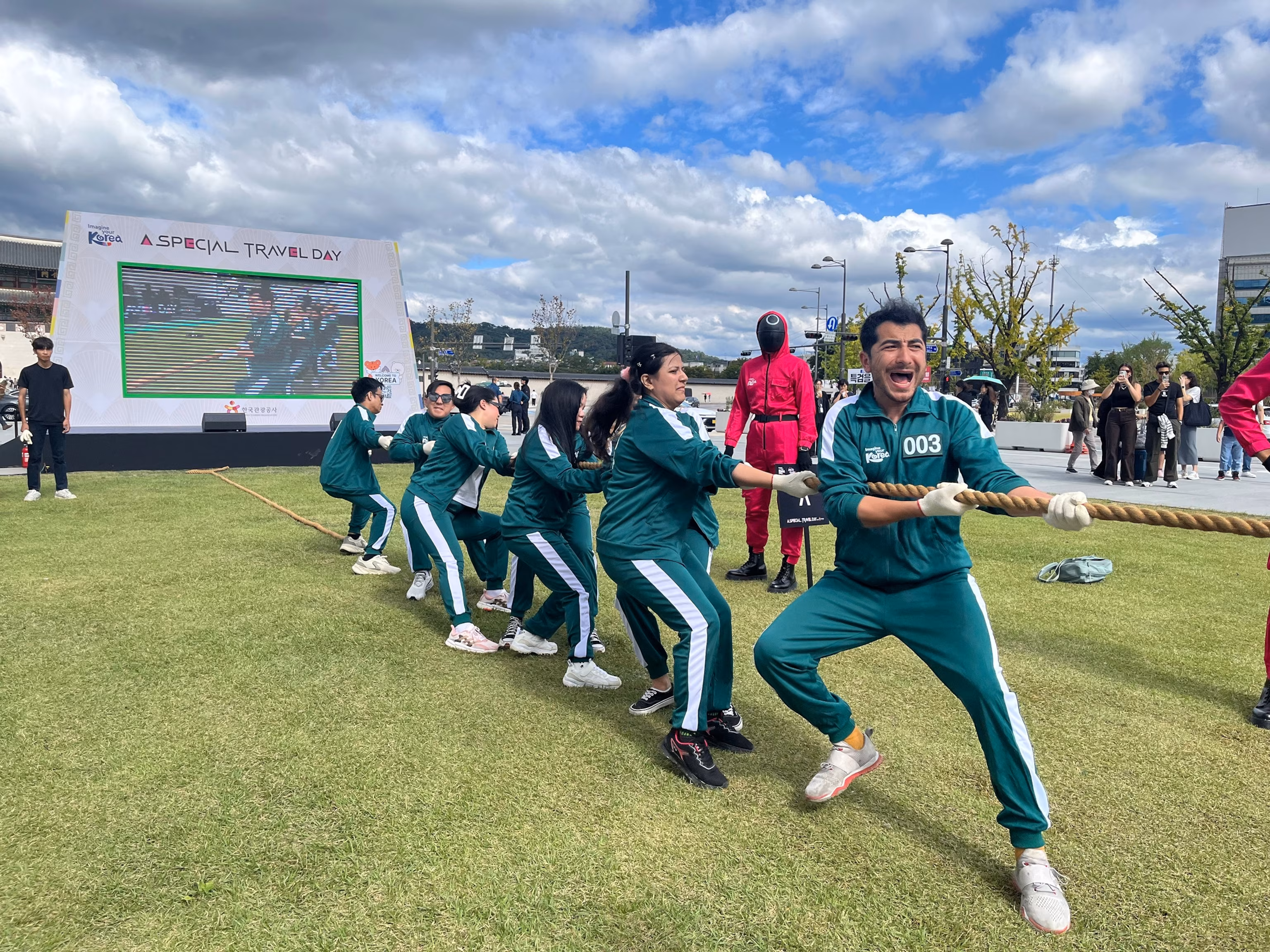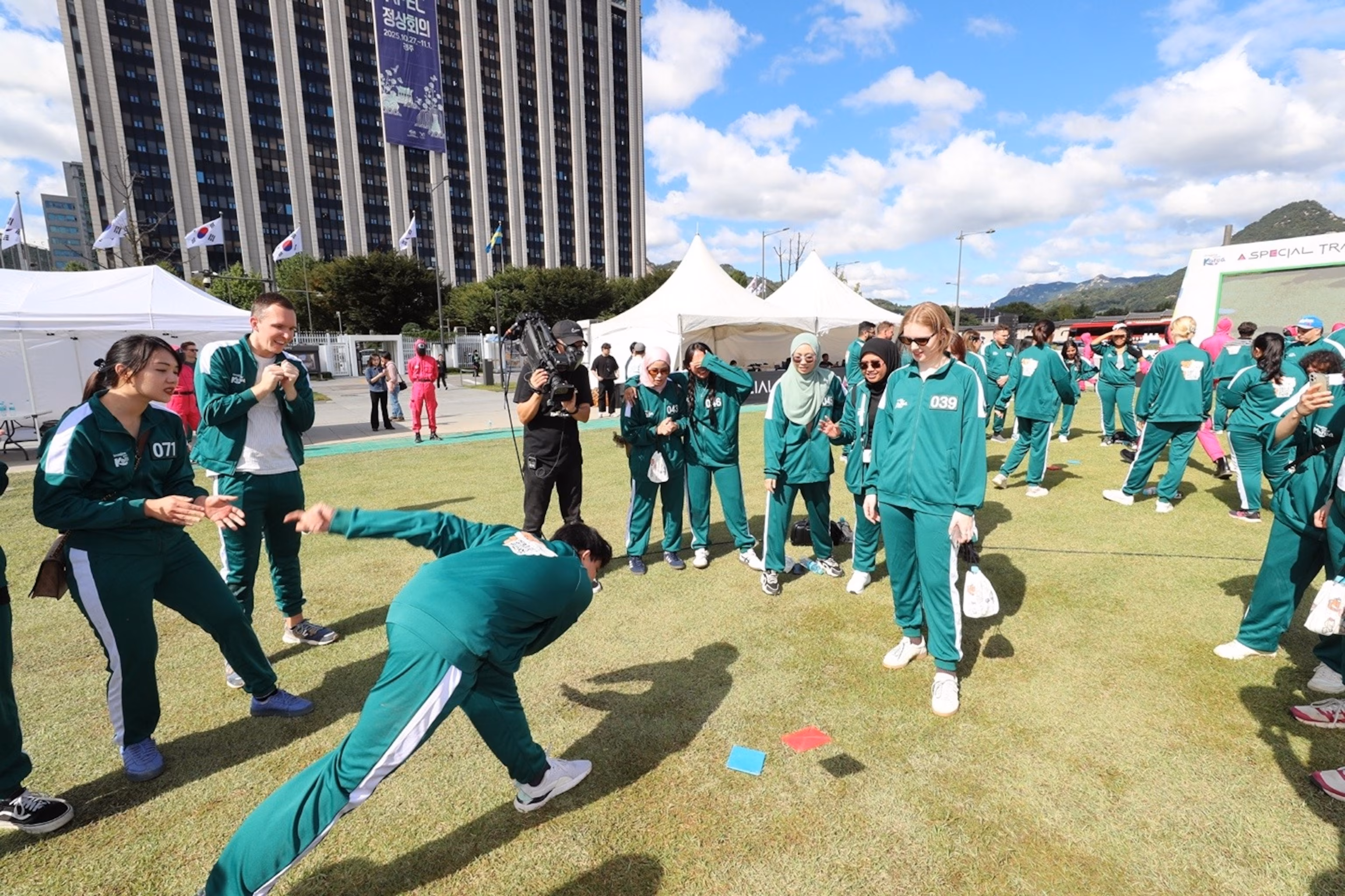 Іноземні громадяни з усього світу зібралися на площі Кванхвамун у четвер, щоб взяти участь у справжній версії гри в кальмарів, але цього разу їхні життя не були під загрозою. Корейська туристична організація