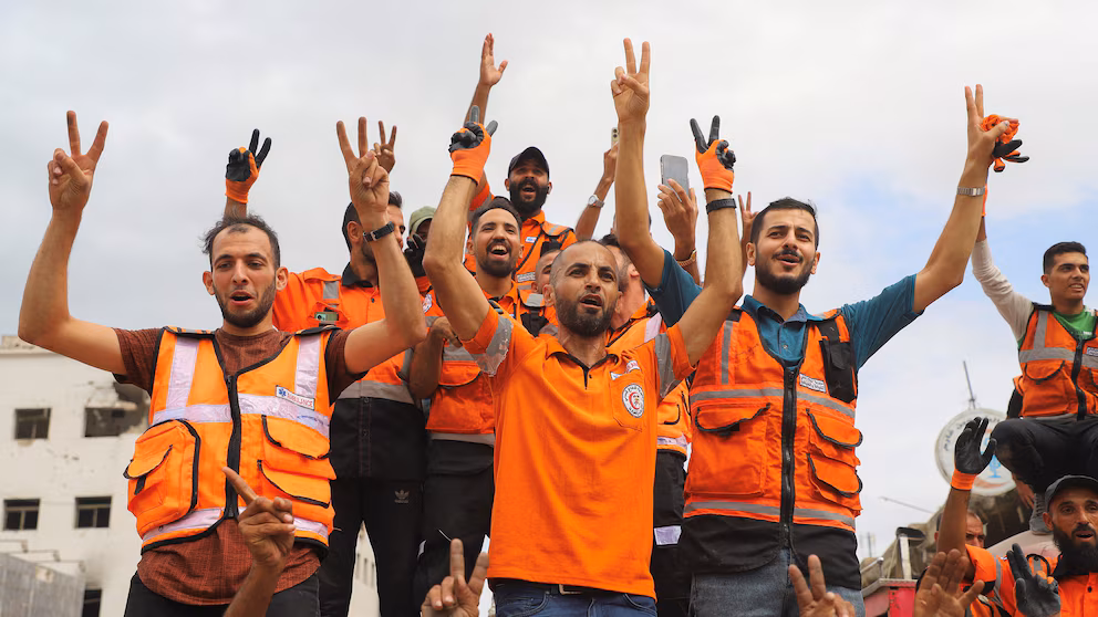 Палестинські працівники служб екстреної допомоги святкують після того, як президент США Дональд Трамп оголосив, що Ізраїль та ХАМАС домовилися про перший етап припинення вогню в Газі, у місті Газа, 9 жовтня 2025 року. Ебрагім Хаджадж/Reuters