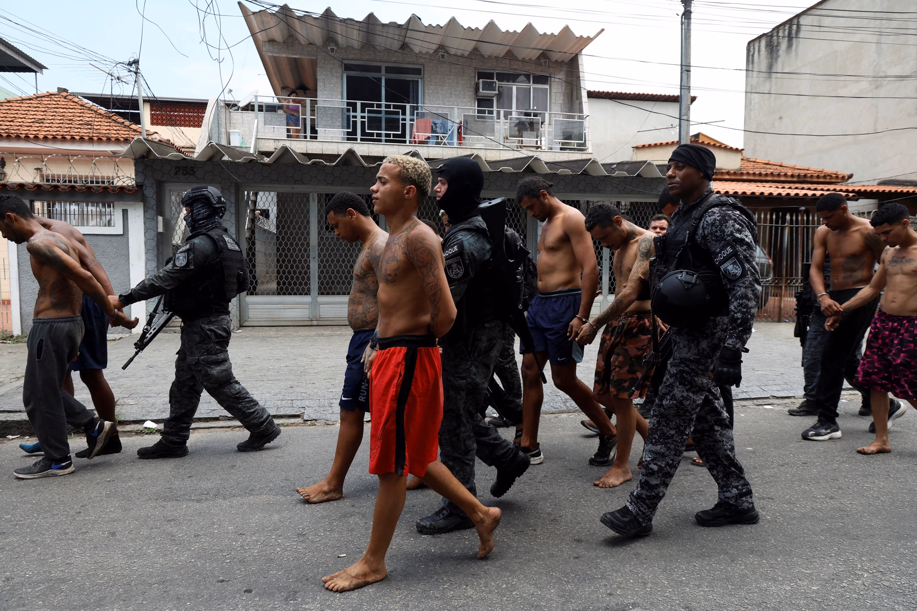 Поліцейські супроводжують підозрюваного, заарештованого під час Operacao Contencao (Операція стримування), з фавели Віла-Крузейро в комплексі Пенья в Ріо-де-Жанейро, Бразилія, 28 жовтня 2025 р. Мауро Піментел/AFP через Getty Images