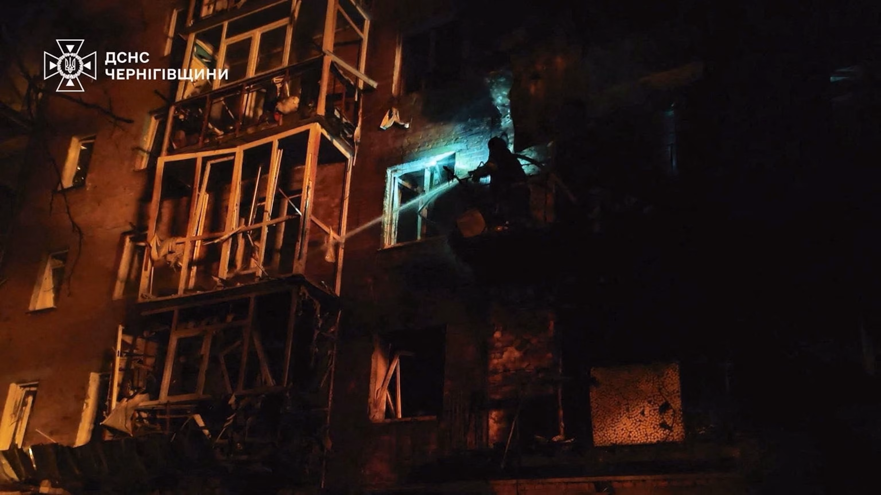 У місті Ніжин, Чернігівська область, горить багатоквартирний будинок, уражений під час удару російського безпілотника, на тлі нападу Росії на Україну. Фото з роздаткового матеріалу, опубліковане 16 жовтня 2025 року. Державна служба України з надзвичайних ситуацій через Reuters.