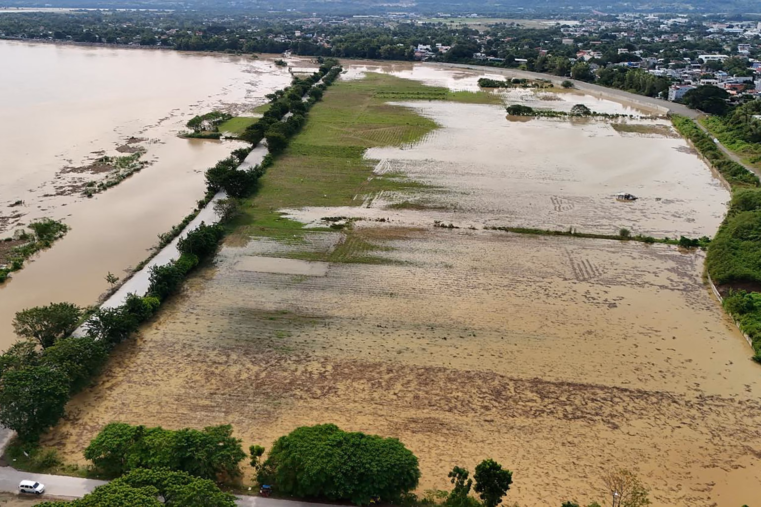 Аерофотознімок затоплених рисових полів поруч із повеною річкою після того, як гребля спустила воду через сильні дощі, спричинені тропічним штормом Матмо в місті Тугегарао, провінція Кагаян, на Філіппінах, 4 жовтня 2025 року. Джон Дімейн/AFP через Getty Images