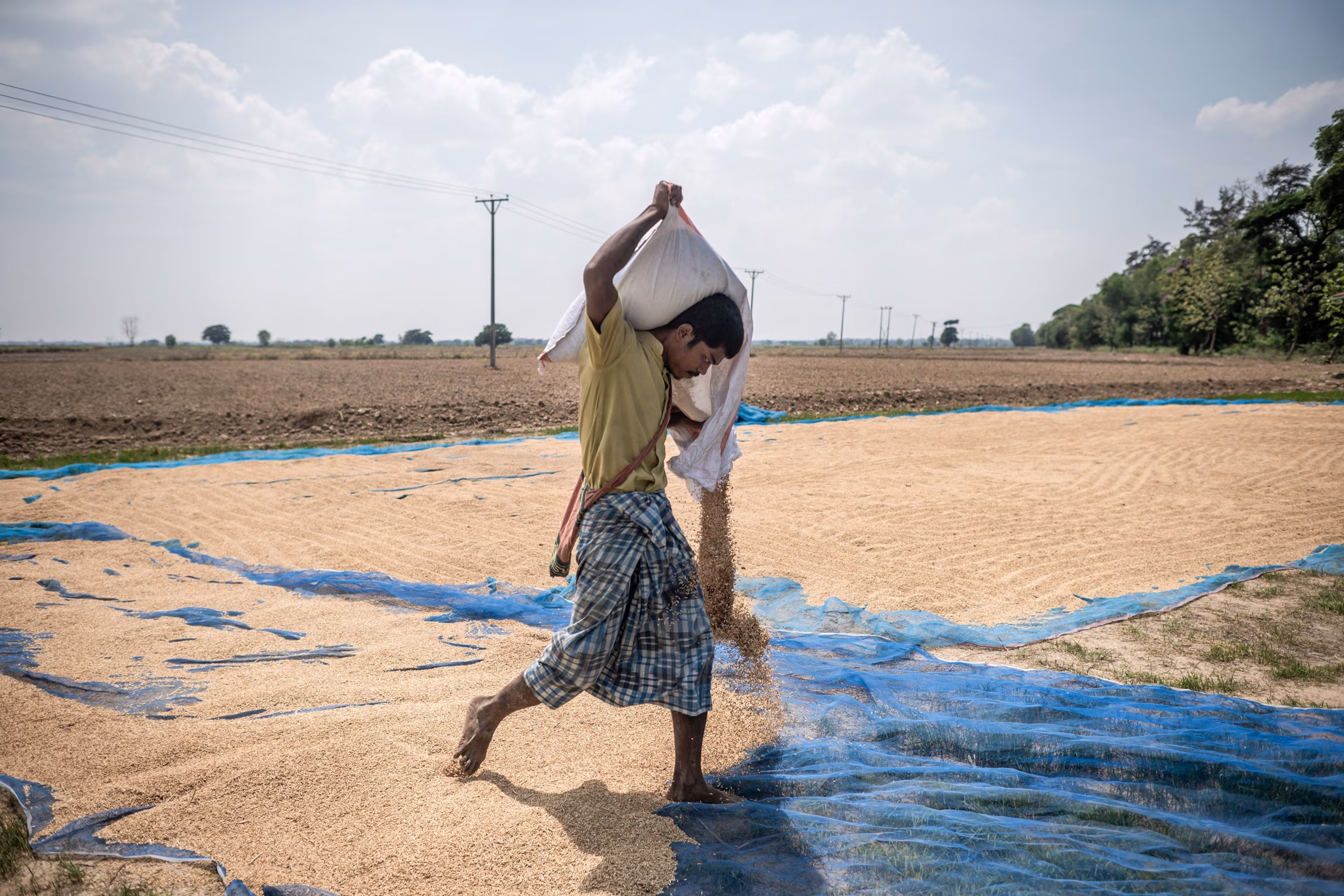 Робітник розстеляє рис-сир під сонцем для сушіння на околиці містечка Залун в дельті річки Іраваді в М'янмі, 8 травня 2025 року. Сай Аунг Мейн/AFP via Getty Images