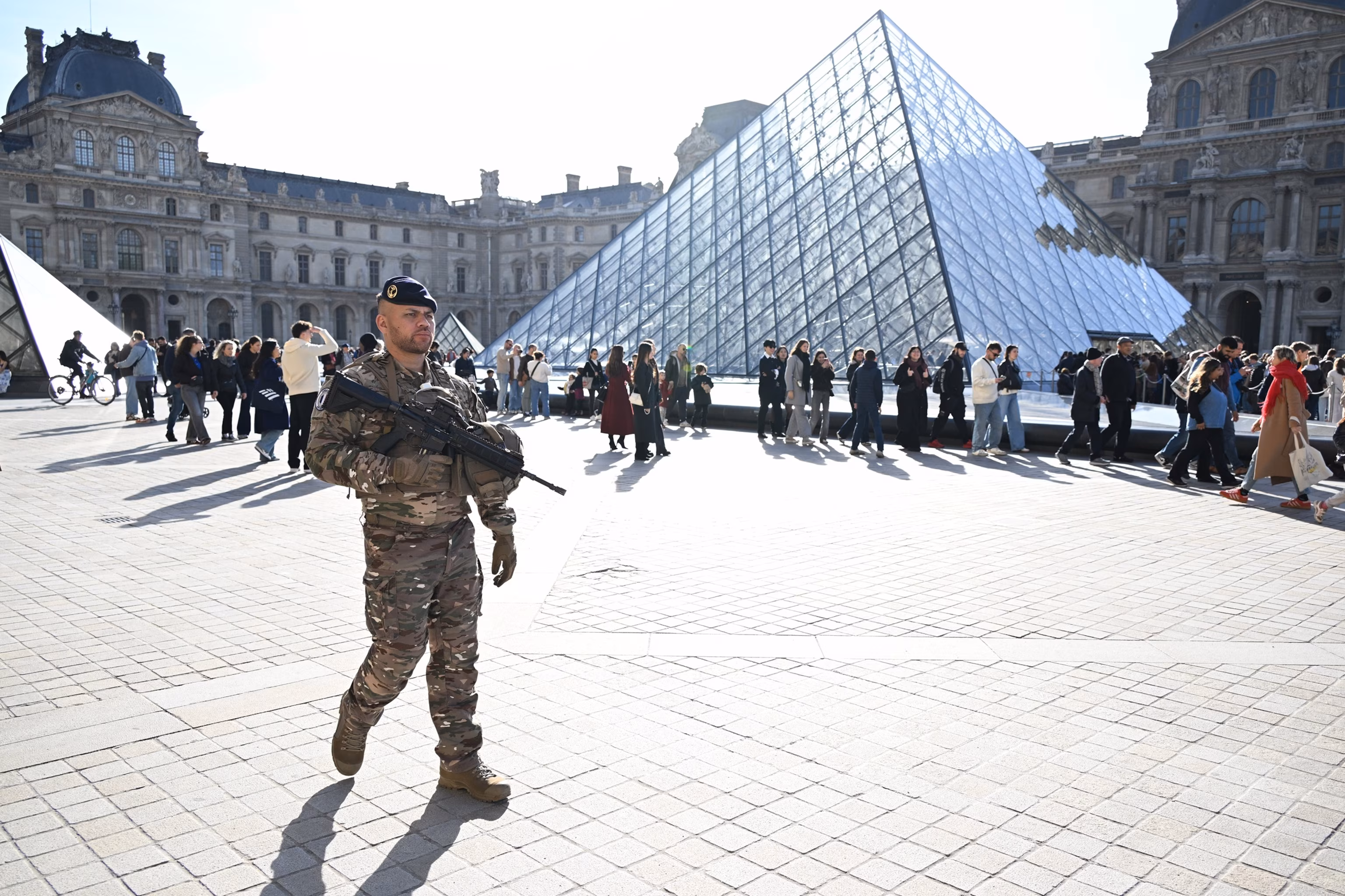 Солдат патрулює внутрішній дворик музею Лувр, четвер, 30 жовтня 2025 року, Париж. (Фото AP/Емма Да Сілва)Емма Да Сілва/AP