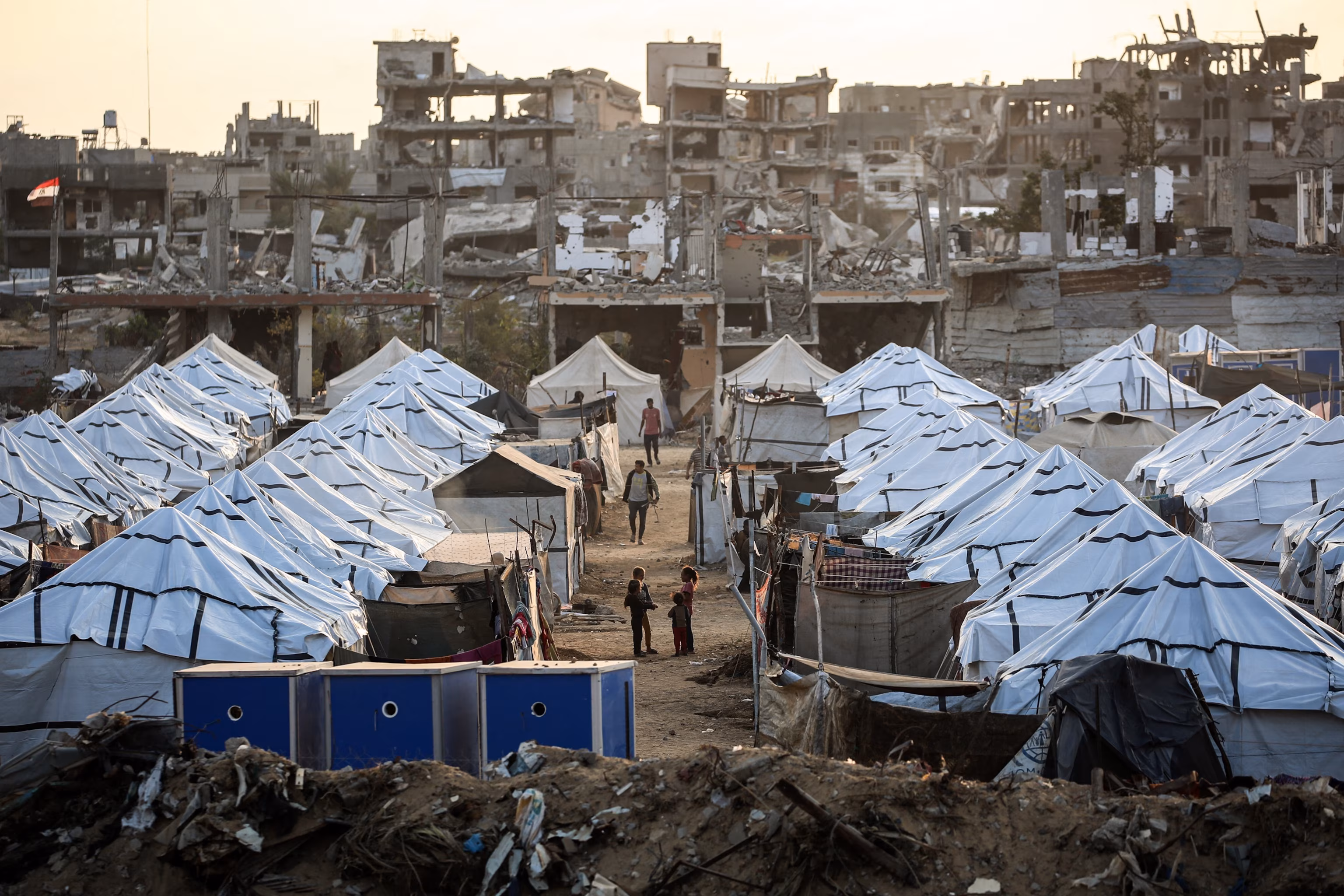 Палестинці ходять навколо своїх наметів у місті Газа 3 листопада 2025 року під час припинення вогню у дворічній війні між Ізраїлем і ХАМАС. AFP через Getty Images